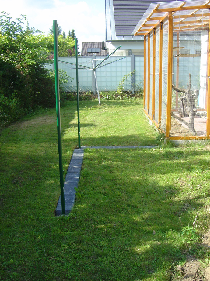 Wenn dann die Mähkante fertig ist, können wir das Netz aufhängen und der Zwinger ist fertig . Nun fehlt nur noch eine Tür, um in den restlichen Teil des Gartens gelangen zu können.