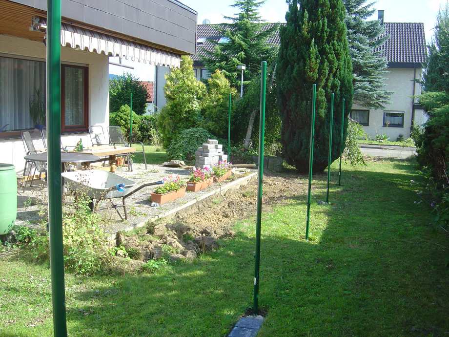 Der Dieter hat gleich am nächsten Tag, als der Bagger weg war die Löcher für die Pfähle gegraben. An diesen Pfählen wollen wir dann ein Netz mit 2,5cm Maschenweite befestigen. Leider wird das ganze noch ein bisschen dauern, da die Brigitte und der Dieter auch noch ein wenig arbeiten müssen, um unseren unterhalt, sprich Futter zu verdienen (es gibt halt nicht umsonst). So die Pfähle sind einbetoniert!